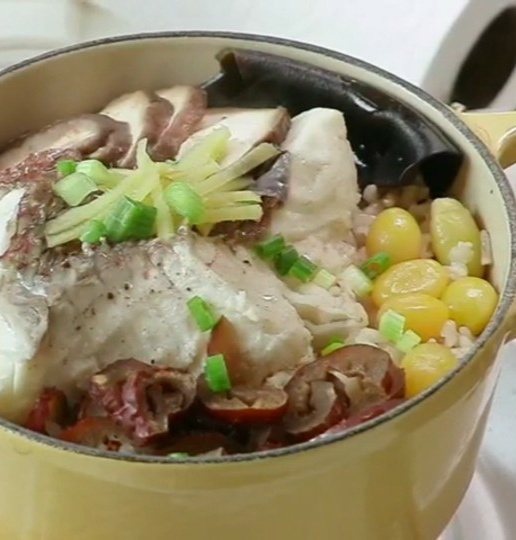 쌀 300g, 도미살 200g, 생강 10g, 표고버섯 반 개, 대추 2개, 청주 1.5T, 간장 1.5T, 은행 7알, 다시마 5cm 1개, 쪽파 약간, 소금, 후추